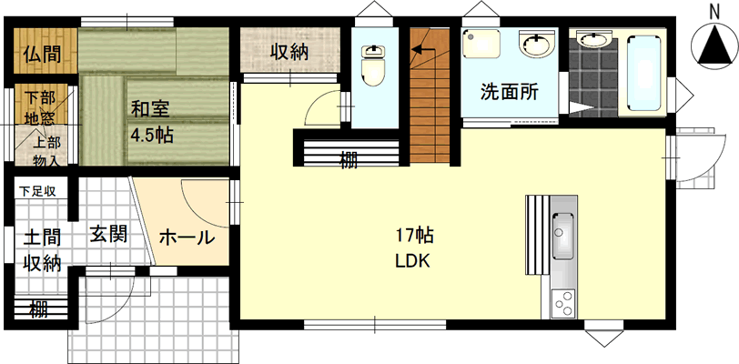 1階面積:57.13m2(17.28坪) 2階面積:48.85m2(14.77坪)
